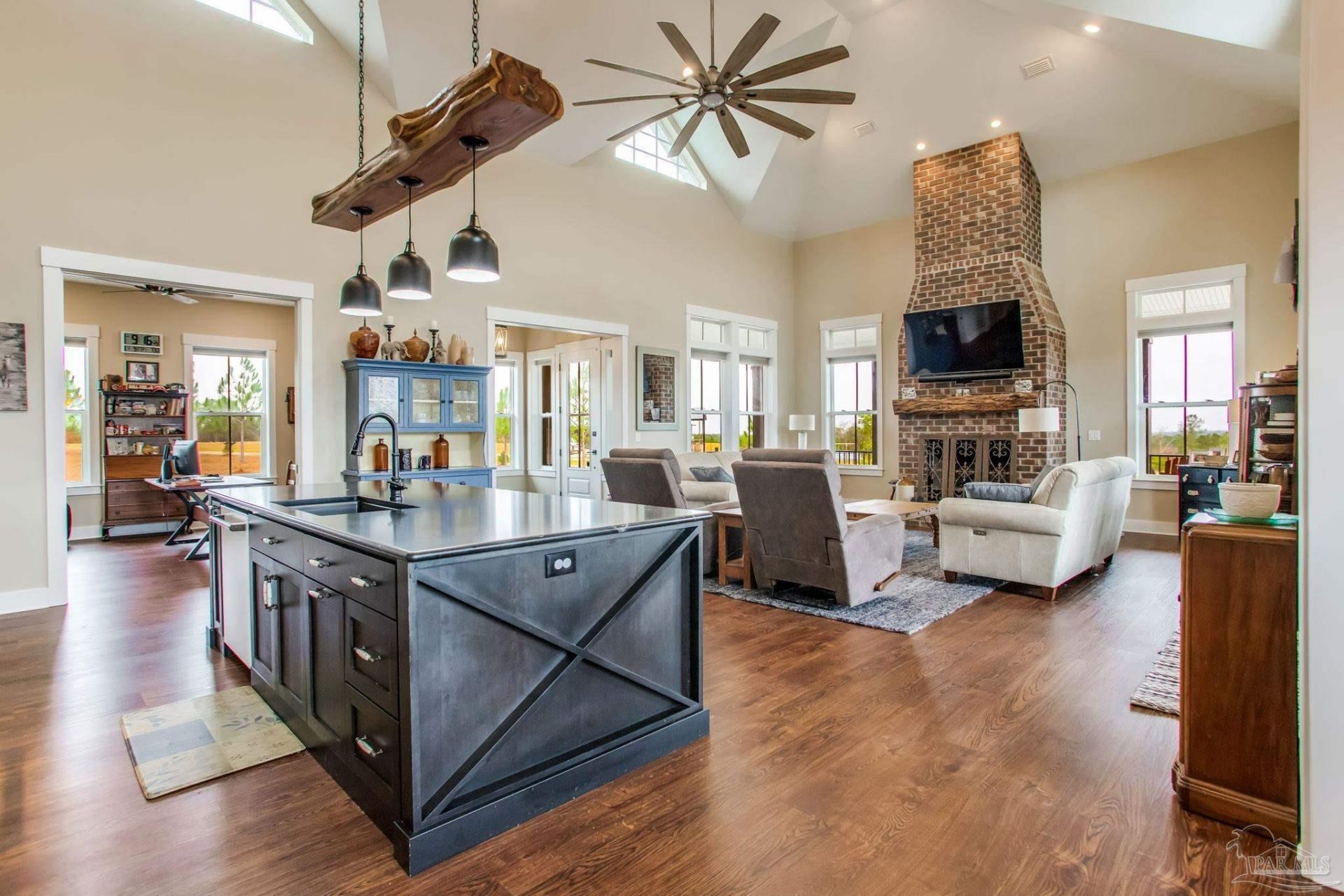 This Southern Living-inspired home, showcases intentional craftsmanship and timeless design, all set on 5 private acres. From the moment you step inside, you're met with LVP flooring throughout and soaring ceilings up to 19'+ tall, creating a light-filled, welcoming atmosphere-designed specifically to showcase breathtaking sunrises and sunsets. The dining room is wrapped in windows at every turn, offering incredible views and an unmatched setting for everyday meals or hosting guests. The main living space is centered around a brick fireplace with a wood-burning firebox and gas log starter, finished with a custom walnut mantle sourced from...read more