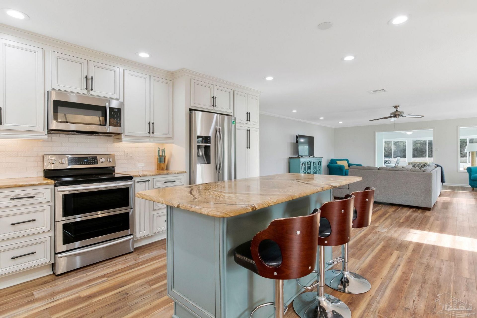 Where the Road Ends, and Waterfront Living Begins. Here's Your Opportunity! This single-story waterfront home on Bayou Grande is ready for its next owners to plant roots and enjoy. From the moment you arrive, the charming cottage-style exterior welcomes you with a covered front porch and serene water views. Step inside and you'll immediately notice the freshly painted interior and open-concept floor plan designed for easy living and entertaining. Luxury vinyl flooring runs throughout the home, creating a cohesive and low-maintenance space. To the left of the entry, the spacious kitchen features a large island, cream-colored wood cabinetry,...read more