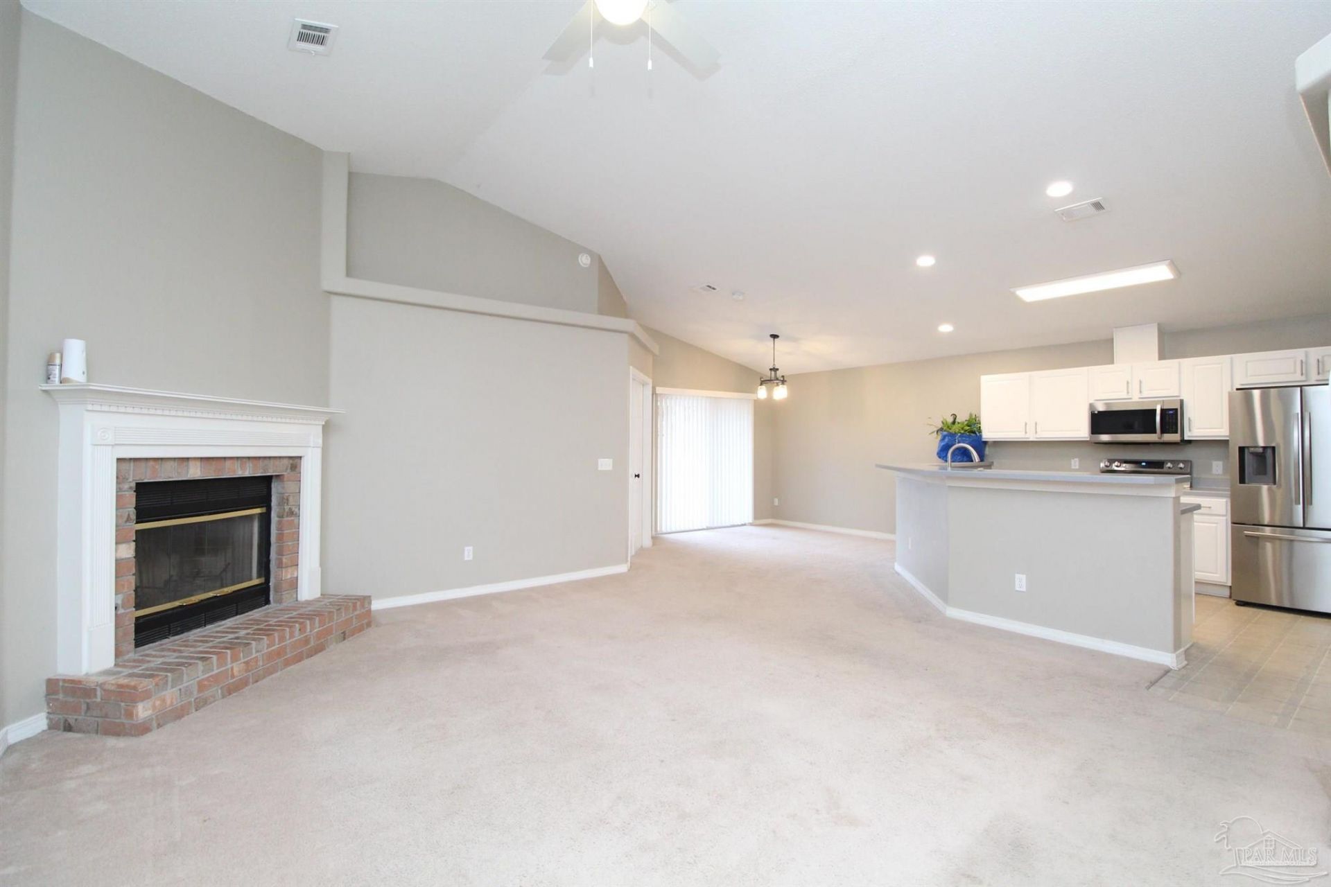 3-bedroom, 2-bathroom home with a 2-car garage, fenced backyard, and functional outdoor living space. The open layout features a living room with vaulted ceilings and a decorative brick fireplace. The kitchen includes stainless steel appliances-refrigerator, electric stove, built-in microwave, and dishwasher-along with a breakfast bar and pantry. The dining area opens to the backyard through sliding glass doors, leading to a covered patio and an additional paver patio. The primary bedroom offers a ceiling fan, a walk-in closet, and a private ensuite with a double vanity, a garden tub, and a separate shower. The additional bedrooms share a...read more
