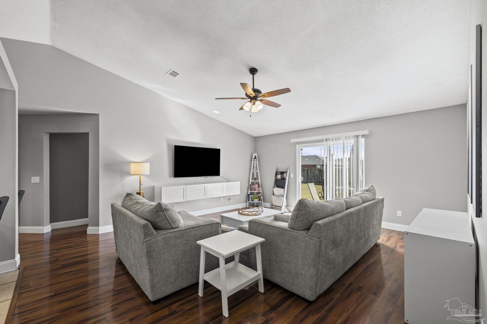 This 3-bedroom, 2-bath brick home with an office or bonus room is located in the Emerald Shores subdivision in southwest Pensacola, just minutes from the back gate of NAS Pensacola. The home features a desirable split-bedroom floor plan, with the primary suite situated on the opposite side of the home from the guest bedrooms and bathroom. The primary suite includes a private en-suite bathroom with a double vanity, tub/shower combination, and a walk-in closet. The open-concept living area is highlighted by vaulted ceilings, creating a spacious feel. The eat-in kitchen is equipped with stainless steel appliances-including a refrigerator, electric...read more