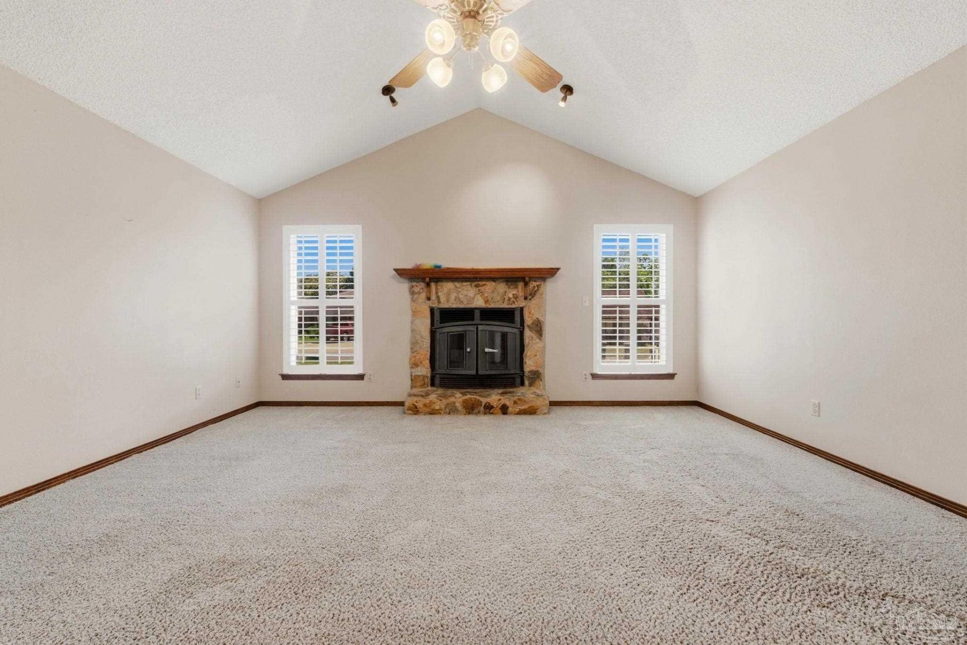 Rare double-lot opportunity! This charming 3-bedroom, 2-bath home offers expansive living on an oversized property, with the adjacent lot included in the sale (total of .77 acres). Step inside to a dramatic vaulted-ceiling living area anchored by a wood-burning fireplace. The kitchen impresses with an island, double oven (2023), and a sunny eat-in area with French doors that open directly to a covered lanai, ideal for seamless indoor-outdoor living. All rooms are equipped with ceiling fans and plantation shutters. The primary suite is a true retreat featuring soaring vaulted ceilings, a private ensuite with double vanities, and an expansive...read more